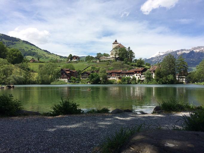 Keywords: lake summer switzerland mountains village landscape water sky holiday swim clouds beautiful