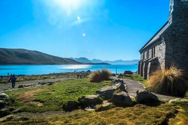 Keywords: outdoor Lake Tekapo is the second-largest of three roughly parallel lakes running north–south along the northern edge of the Mackenzie Basin in the South Island of New Zealand (the others are Lake Pukaki and Lake Ohau). It covers an area of 83 square kilometres (32 sq mi), and is at an altitude of 700 metres (2,300 ft) above sea level. The lake is fed at its northern end by the braided Godley River, which has its source in the Southern Alps to the north. The lake is a popular tourist destination, and several resort hotels are located at the township of Lake Tekapo at the lake's southern end. The Lake Tekapo Regional Park, administered by Environment Canterbury, is located on the southern shore of the lake. Situated on the shores of Lake Tekapo is the Church of the Good Shepherd, which, in 1935, was the first church built in the Mackenzie Basin. en.wikipedia.org/wiki/Lake_Tekapo Lake Tekapo is the second-largest of three roughly parallel lakes running north–south along the northern edge of the Mackenzie Basin in the South Island of New Zealand (the others are Lake Pukaki and Lake Ohau). It covers an area of 83 square kilometres (32 sq mi), and is at an altitude of 700 metres (2,300 ft) above sea level. The lake is fed at its northern end by the braided Godley River, which has its source in the Southern Alps to the north. The lake is a popular tourist destination, and several resort hotels are located at the township of Lake Tekapo at the lake's southern end. The Lake Tekapo Regional Park, administered by Environment Canterbury, is located on the southern shore of the lake. Situated on the shores of Lake Tekapo is the Church of the Good Shepherd, which, in 1935, was the first church built in the Mackenzie Basin. en.wikipedia.org/wiki/Lake_Tekapo |