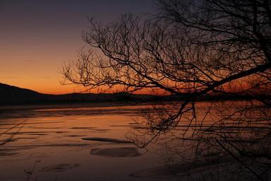 Keywords: lake winter evening sunset ice cold water mountains bank
