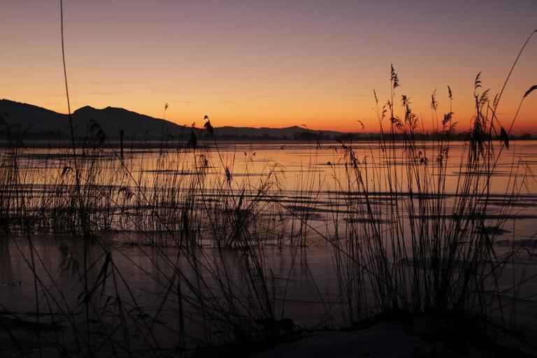 Keywords: lake winter evening sunset ice cold water mountains bank