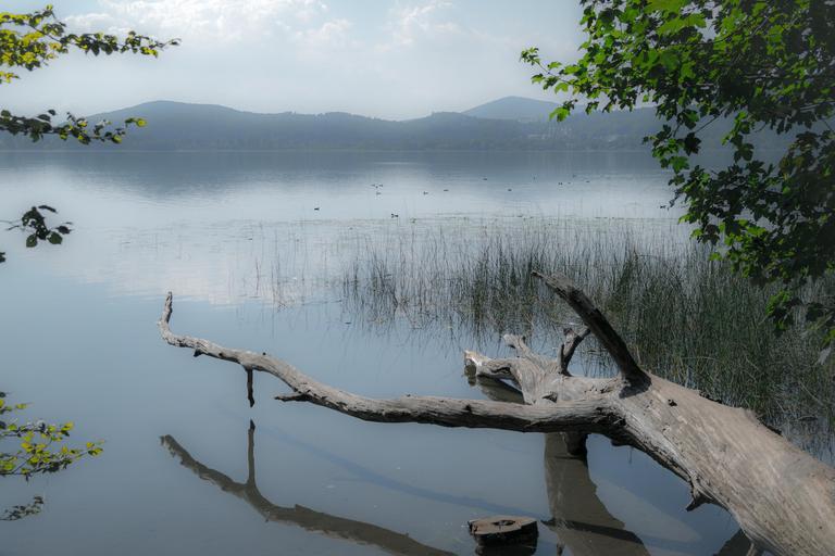 Keywords: lake wood laacher lake maria laach haze fog morgenstimmung morning log water waters tree wood in the water decay mirroring tree stump