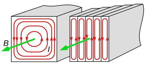 Keywords: Laminated core eddy currents.svg laminated core in a transformer prevents energy losses due to eddy currents The alternating current in the transformer's winding creates an alternating magnetic field <span style color green; >B green arrows</span> within the transformer's steel core Since the core is electrically conductive the field induces circulating loops of electric current in the core <span style color red; >red lines</span> called eddy currents due to Faraday's law of induction which flow in planes perpendicular to the field The current flowing through the resistance of the core dissipates energy as heat causing energy losses To reduce the power losses instead of a solid core left many transformers use a laminated core right The core is made of a stack of thin steel laminations with a nonconductive coating on the surface The eddy currents can't cross from one lamination to the next so the only eddy currents that can flow must flow within the thickness of each individual lamination Since the magnitude of the current is proportional to the area enclosed by the loop this reduces the eddy currents greatly and thus the energy lost in the core 2015-03-27 own Chetvorno other versions cc-zero Uploaded with UploadWizard Transformer schemas Eddy currents |