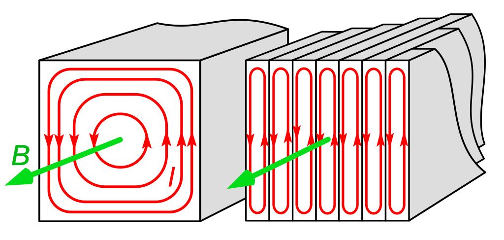 Keywords: Laminated core eddy currents 2.svg laminated core in a transformer prevents power losses due to eddy current s The alternating current in the transformer's winding creates an alternating magnetic field <span style color green; >B green arrows</span> within the transformer's steel core Since the core is electrically conductive the field induces circulating loops of electric current in the core <span style color red; >red lines</span> called eddy current s due to Faraday's law of induction which flow in planes perpendicular to the field The current flowing through the resistance of the core dissipates energy as heat causing power losses To reduce the power losses instead of a solid core left many transformers use a laminated core right The core is made of a stack of thin steel laminations with a nonconductive coating on the surface The eddy currents can't cross from one lamination to the next so the only eddy currents that can flow must flow within the thickness of each individual lamination Since the magnitude of the current is proportional to the area enclosed by the loop this reduces the eddy currents greatly and thus the energy lost in the core In the diagram the magnetic field B and the eddy currents are shown in one direction; they actually reverse direction with each half-cycle of the alternating current 2016-02-03 own Chetvorno other fields + 26 d cc-zero Transformer schemas Eddy currents |