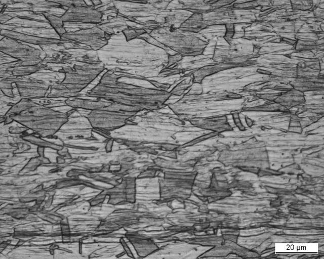 Keywords: Lamine316L.jpg fr Grains dans un métal micrographie MO d'un acier inoxydable 316L laminé qui présente la microstructure caractéristique d'une métal laminé fortement écroui Ceci se remarque dans la morphologie des grains plutôt allongé De plus l'attaque chimique a mise en évidence un fibrage qui provient de la ségrégation lors du laminage own Q2Q7 2009 Steel cross sections |