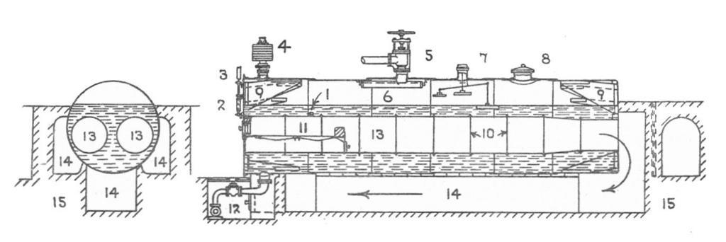 Keywords: Lancashire boiler, section (Bentley, Sketches of Engine and Machine Details).jpg The Lancashire boiler usually varies from 5'6 diameter up to 8'6 diameter and from 15 feet to 30 feet in length The Cornish boiler is similar but with one central furnace instead of two Cornish boilers range from 4' to 7' diameter and from 10 feet to 30 feet in length - 1 Fusible plug - 2 Water level gauge - 3 Steam pressure gauge - 4 Dead weight safety valve - 5 Main stop valve - 6 Steam collecting pipe - 7 High and Low Water Safety Valve - 8 Manhole - 9 Gusset stay - 10 Adamson's Rings - 11 Firebars - 12 Blow-off Cock - 13 Furnaces - 14 Flues - 15 Brickwork 107 Lancashire boilers |