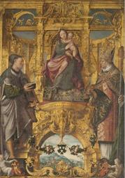 Keywords: Lanceloot Blondeel - Madonna with painter guild protectors Saints Lukas and Eligus.jpg original reverse</gallery> Saint Salvator's Cathedral technique oil canvas 138 x 98 cm http //balat kikirpa be/object/89893 1545 creator Lanceloot Blondeel Weapon of the painters' sculptors' and saddlemakers' guild PD-Art-100 Paintings of Madonna and Child Paintings by Lanceloot Blondeel Museum of Sint-Salvatorskathedraal |