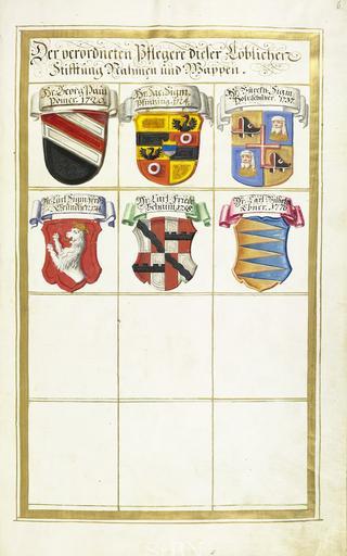 Keywords: Landauer II 006 r.jpg Wappen der Pfleger der Landauerschen Zwölfbrüderstiftung Georg Paul Pömer 1720 Sigm und Pfintzing 1724 Burckh ard Sig mund Holtzhuher 1737 Carl Sigm und Ferd inand Grundherr 1744 Carl Friedr ich Behaim 1758 Carl Wilhelm Ebner 1776 Transkription und weitere Informationen siehe http //www nuernberger-hausbuecher de/75-Amb-2-279b-6-r/data Hausbuch der Landauerschen Zwölfbrüderstiftung Band 2 Nürnberg 1708 “1806 Stadtbibliothek Nürnberg 279b 2° via http //www nuernberger-hausbuecher de/ 1708 “1806 anonymous PD-old-100 Hausbuch der Landauerschen Zwölfbrüderstiftung Band 2 Coats of arms in the Zwölfbrüderbücher Supervisors in the Zwölfbrüderbücher Coats of arms of Ebner von Eschenbach family |