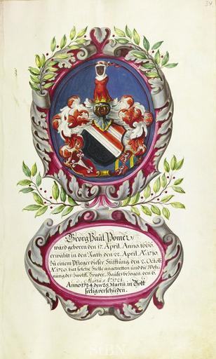 Keywords: Landauer II 034 r.jpg Transkription und weitere Informationen siehe http //www nuernberger-hausbuecher de/75-Amb-2-279b-34-r/data Wappen des Georg Paul Pömer Pömer; Poemer Pfleger der Landauerschen Zwölfbrüderstiftung Hausbuch der Landauerschen Zwölfbrüderstiftung Band 2 Nürnberg 1708 “1806 Stadtbibliothek Nürnberg 279b 2° via http //www nuernberger-hausbuecher de/ 1721 anonymous PD-old-100 Hausbuch der Landauerschen Zwölfbrüderstiftung Band 2 Supervisors in the Zwölfbrüderbücher Coats of arms in the Zwölfbrüderbücher Coats of arms of Pömer family Pomer |