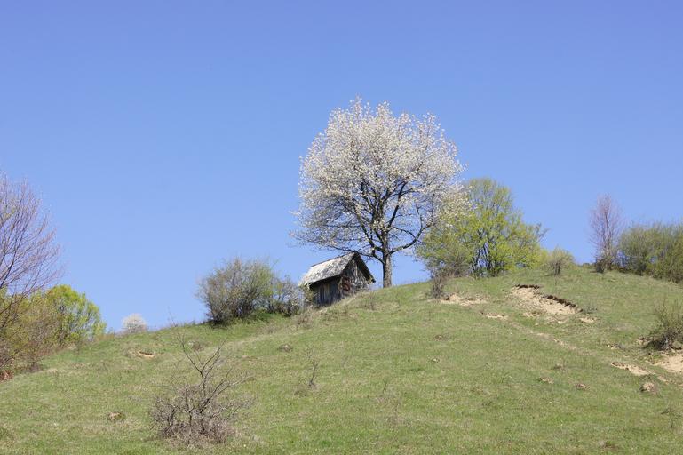 Keywords: landscape hill tree bloom blossom bloom cottage romania