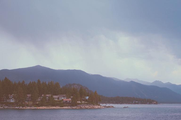Keywords: landscape lake water houses coast mountains sky clouds
