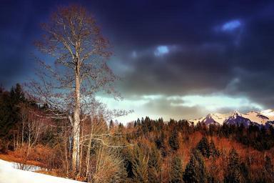 Keywords: landscape mountains forest trees old tree snow lighting sky clouds weather mood