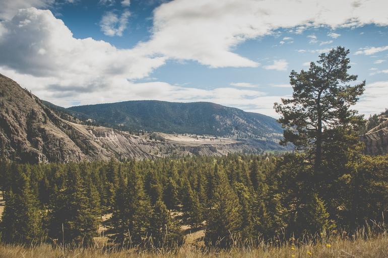 Keywords: landscape mountains hills valleys fields trees forest grass nature sky clouds sunny