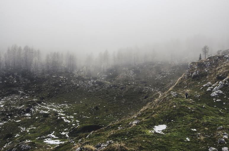 Keywords: landscape mountains rocks stones trees row fog mist person hiker