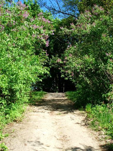 Keywords: landscape nature bloom spring lilac lilac bloom flowering trees footpath walkway forest path park green path pathway wood wooden