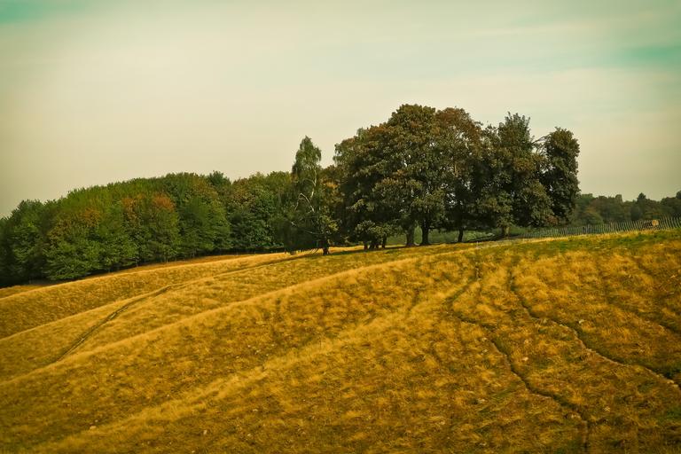 Keywords: landscape nature meadow forest of course clouds sky hill idyll rest hiking field wide distant view tree group trees relaxation relax