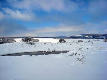 Keywords: landscape scenic winter snow ice sky clouds nature outside country countryside pond water mountains