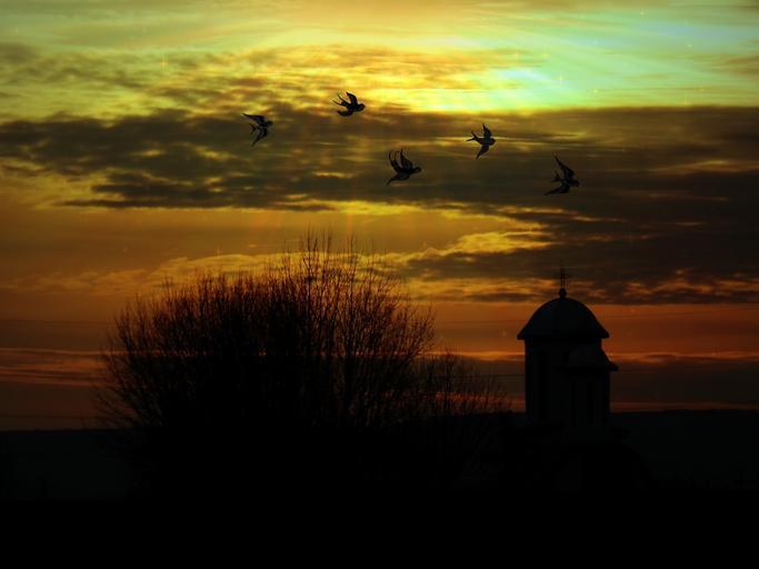 Keywords: landscape sky birds church tree cloud in the evening