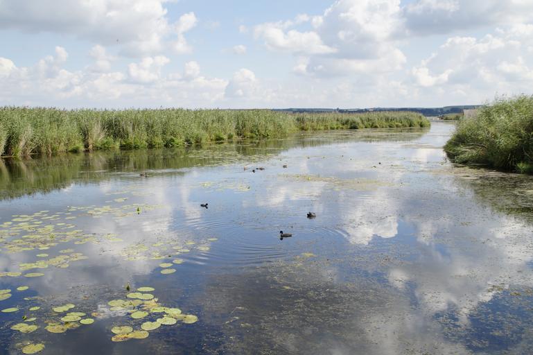 Keywords: landscape spring lake nature reserve nature moorland wetland summer grasses reed silted nature conservation southern germany sky clouds summer landscape baden württemberg mirroring water lake