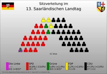 Keywords: Landtag Saarland 13.svg Sitzverteilung des 13 Saarländischen Landtages Seatings in the 13<sup>th</sup> session of the Landtag state diet of Saarland Own 23 23 21 August 2009 UTC chris 論 Election apportionment diagrams of Landtag of Saarland Landtag Saarland 13 |