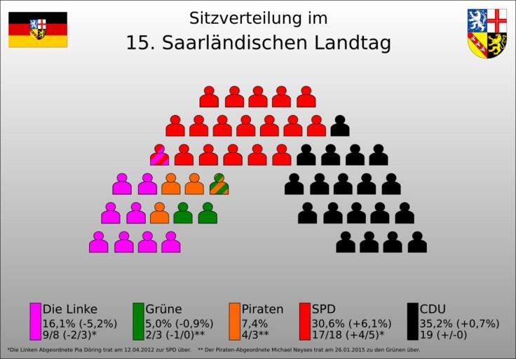 Keywords: Landtag Saarland 15.svg mld Sitzverteilung des 15 Saarländischen Landtages vorläufiges amtliches Endergebnis Quelle ARD Seatings in the 15<sup>th</sup> session of the Landtag state diet of Saarland preliminary official results Own 18 01 25 March 2012 UTC chris 論 Cc-zero Election apportionment diagrams of Landtag of Saarland Landtag Saarland 15 Events in Saarland 2012 in Saarland |