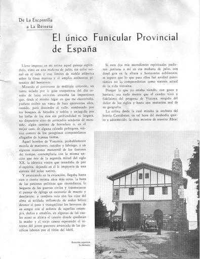 | Keywords: Larrainetako funikularrari buruzko erreportaia 01.jpeg eu Larrainetako funikularrari buruzko erreportaia VIZCAYA aldizkariaren lehen alean Eskontrillatik Larrainetara es Reportaje sobre el funicular de La Reineta en el primer número de la revista VIZCAYA De La Escontrilla a La Reineta 1953ko uztaila - Julio de 1953 own Revista VIZCAYA Aldizkaria Gallarta <span class signature-talk ></span> Jabetza publikoa - Dominio público Cc-zero Biscay | ||||