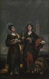 Keywords: Las santas Justa y Rufina (boceto).jpg Este es uno de los varios bocetos que Francisco de Goya realize antes de pintar el cuadro de las Santas Justa y Rufina destinado al altar de la Sacristía de los Cálices de la catedral de Sevilla España donde aún permanece El cabildo catedralicio sevillano le encargó el mencionado cuadro a Goya en 1817 y por mediación de Agustín Ceán Bermúdez que era un erudito y escritor de arte y amigo personal de Goya Las santas alfareras Justa y Rufina que son las patronas de Sevilla fueron martirizadas por haberse negado a adorar una imagen de la diosa Venus y siempre suelen ser representadas junto a objetos de barro como símbolo de su profesión y con las palmas del martirio En esta obra un león lame mansamente el pie de Santa Rufina herido por haberla forzado a caminar desde la sierra hasta Sevilla y esta ciudad aparece al fondo destacándose la Torre de la Giralda de la catedral sevillana que según la tradición quedó en pie por la intervención milagrosa de las santas durante el terremoto que asoló Sevilla en 1504 1817 oil canvas Size cm 29 45 Catedral de Santa María de la Sede de Sevilla Sacristía de los Cálices de la catedral de Sevilla https //www museodelprado es/coleccion/galeria-on-line/galeria-on-line/obra/santa-justa-y-santa-rufina/ object history exhibition history credit line accession number https //www museodelprado es/coleccion/galeria-on-line/galeria-on-line/obra/santa-justa-y-santa-rufina/ PD-old-100 Santas Justa y Rufina Francisco de Goya Paintings by Goya in the Prado Museum Paintings of Seville |