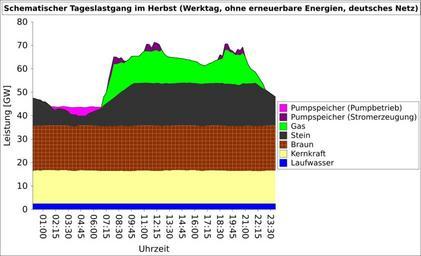 Keywords: Lastgang.svg en Schematic power load profile from the German power grid in the course of a day itemized by different technologies of power plants de Die Abbildung zeigt schematisch den Einsatz der unterschiedlichen Kraftwerkstechnologien für einen typischen Tagesgang Werktag in einer Herbstwoche des Stromverbrauches sogenannter Lastgang im deutschen Elektrizitätsnetz Es wurde versucht die tatsächliche Verhältnismäßigkeit und Leistungsgröße im Schaubild wiederzugeben In den Nachtstunden füllen die Pumpspeicherkraftwerke ihre Speicherbecken auf und verursachen zusätzlichen Verbrauch Pumpbetrieb Fluktuierende Erzeuger wie Wind- oder Sonnenenergie wurden zur Vereinfachung weggelassen own Seisofrei 2011-01-16 Datei Tagesgang png Eigene Auftragung mit Anlehnung an žDer Weg zu 100 erneuerbaren Energien am Beispiel der Stadtwerke Schwäbisch Hall GmbH S 13 http //www forum-netzintegration de/uploads/media/DUH_VanBergen_WS2_07052010 pdf BMWi žVoraussetzungen einer optimalen Integration erneuerbarer Energien in das Stromversorgungssystem S 36 http //www bmwi de/BMWi/Redaktion/PDF/Publikationen/Studien/endbericht-optimale-intergration-erneuerbare-energie property pdf bereich bmwi sprache de rwb true pdf und Hilfsblätter zur Vorlesung Energiewirtschaft EWS Prof Dr -Ing Gregor Krause S 12 http //www krause fh-aachen de/userfiles/file/EWS/ews_kap4 pdf Cc-zero Electric power generation |
