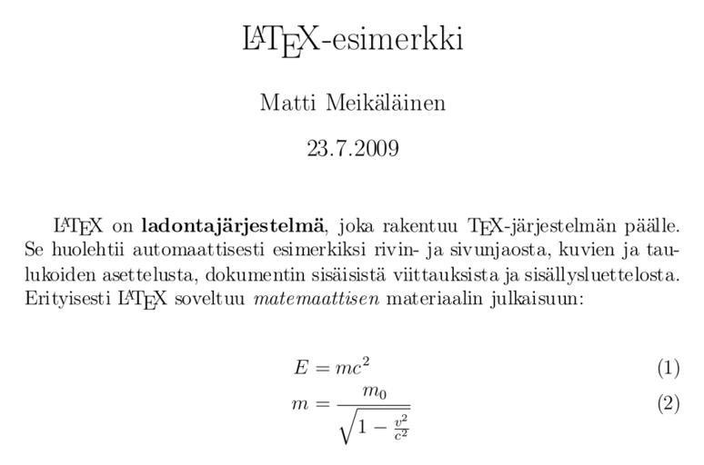 Keywords: LaTeX-esimerkki.svg en LaTeX example in finnish fi LaTeX-esimerkki suomeksi Own work by uploader Source code <source lang latex > \documentclassa4paper 12pt finnish article \usepackage babel \usepackageutf8 inputenc \usepackageT1 fontenc \usepackage amsmath \title \LaTeX-esimerkki \author Matti Meikäläinen \date 23 7 2009 \begin document \maketitle \LaTeX on \textbf ladontajärjestelmä joka rakentuu \TeX -järjestelmän päälle Se huolehtii automaattisesti esimerkiksi rivin- ja sivunjaosta kuvien ja taulukoiden asettelusta dokumentin sisäisistä viittauksista ja sisällysluettelosta Erityisesti \LaTeX soveltuu \textit matemaattisen materiaalin julkaisuun Tämä on kommentti eikä näy lopullisessa dokumentissa Seuraavassa on demonstroitu matemaattisten kaavojen esittämistä \begin align E mc 2 \\ m \frac m_0 \sqrt 1-\frac v 2 c 2 \end align \end document </source> Tmn 2009-09-03 Images with LaTeX source code |