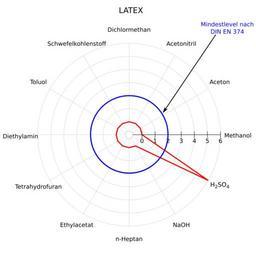 Keywords: Latex-Spinne v2.svg Spinnendiagramm Beständigkeit von Latex-Schutzhandschuhen Glove selection Latex Own after http //www dguv de/dguv/medien/ifa/de/pra/chemikalienschutzhandschuhe/pdf/latex pdf 2015-01-23 Kopiersperre code by StefanPohl PD-own Inkscape gnuplot reset set term svg size 700 700 fname 'Verdana' fsize 12 set size square 9 set lmargin at screen 15 set tmargin at screen 9 set angles degrees unset key unset border set polar set rtics 0 0 1 1 2 2 3 3 4 4 5 5 6 6 7 set rrange 1e-2 7 unset xtics unset ytics set grid polar 30 lt 1 lc 0 lw 0 3 set_label x text sprintf set label ' s' at 8 cos f 8 sin f center text x x eval set_label 0 Methanol 0 eval set_label 30 Aceton 0 eval set_label 60 Acetonitril 0 eval set_label 90 Dichlormethan 0 eval set_label 120 Schwefelkohlenstoff 0 eval set_label 150 Toluol 0 eval set_label 180 Diethylamin 0 eval set_label 210 Tetrahydrofuran 0 eval set_label 240 Ethylacetat 0 eval set_label 270 n-Heptan 0 eval set_label 300 NaOH 6 eval set_label 330 H2SO4 0 set output 'latex svg' plot - u 1 2 t Latex w l lt 1 lw 3 lc rgb 0xFF0000 0 1 30 1 60 1 90 1 120 1 150 1 180 1 210 1 240 1 270 1 300 1 330 7 360 1 e unset output Chemical resistance diagrams |
