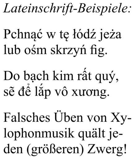 | Keywords: Latin script samples (Pangrams from Polish, Vietnamese, and German) 2.svg en Latin script samples Pangrams from Polish Vietnamese and German title in German Text of the Polish and German samples taken from Wikipedia w de Pangram Vietnamese text from https //aseaanarion wordpress com/2010/12/17/dogs-are-not-that-lazy/ here The font used is Times New Roman 2015-10-18 own Karl432 other versions Otherversion File Latin script samples Pangrams from Polish Vietnamese and German 1 svg English headline cc-zero Additionally the following applies PD-text Latin alphabet typography Times New Roman Uploaded with UploadWizard |