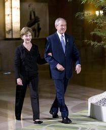 Keywords: Laura Bush and George W Bush 20080707.jpg en President George W Bush attended a dinner with Laura Bush at the Windsor Hotel Toya Resort and Spa in Tōyako Town Abuta District Hokkaidō on July 7 2008 http //www whitehouse gov/news/releases/2008/07/images/20080707_d-0354-1-631v html President George W Bush and Mrs Laura Bush arrive at the Dinner with G-8 Leaders and Spouses Monday July 7 2008 at the Windsor Hotel Toya Resort and Spa in Toyako Japan White House photo by Eric Draper White House photo by Eric Draper 2008-07-07 PD-USGov Laura and George Bush George W Bush in 2008 34th G8 summit Photographs by Eric Draper |