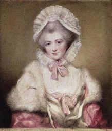 Keywords: Lavinia, Countess Spencer, née Bingham (1762-1831) by Ozias Humprhy, after sir Joshua Reynolds.jpg en Lavinia Countess Spencer née Bingham 1762-1831 in fur-bordered pink coat over white dress with pink bow at corsage lace-bordered white bonnet tied with pink ribbon tied below chin on card rectangular 95 x 83 mm Christie's online 5336473 Ozias Humphry 18th/19th century PD-old-100 Lavinia Bingham Countess Spencer Ozias Humphrey Bonnets in art Females with pink ribbons in art Birdskin clothing 19th-century fur fashion |