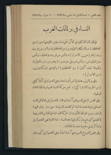 | Keywords: Layla, Issue 8, May 15, 1924 WDL2846.jpg Artwork ru Хассун Паулина fr Hassoun Paulina en Hassoun Paulina zh 哈桑 琳 pt Hassoun Paulina ar حسون بولينا es Hassoun Paulina ru Лейла выпуск 8 15 мая 1924 г fr Layla numéro 8 15 mai 1924 en Layla Issue 8 May 15 1924 zh Layla ,第 8 ,1924 年 5 15 日 pt Layla Edição 8 15 de maio de 1924 ar ليلى، العدد 8، 15 أيار 1924 ru <i> Лейла </i> был пе вым женским жу налом опубликованным в И аке Этот жу нал впе вые выпущенный в 1923 году был посвящен новейшим полезным воп осам связанным с наукой искусством лите ату ой социологией и в частности воспитанию и обучению девочек здо овью семьи и д угим воп осам касающимся ведения домашнего хозяйства После установления национального п авительства в И аке появилось несколько жу налов и газет посвященных женским воп осам <i> Лейла </i>ознаменовал собой за ождение женской п ессы в И аке этот жу нал считается одним из факто ов повлиявших на возникновение и фо ми ование а абского женского движения Жу нал выпускался под девизом а пути к воз ождению и акской женщины и асп ост анял новости культу ы об азования и воп осов касающихся семьи а также возглавлял кампанию за освобождение женщин В числе его азделов были следующие Испытание п авом алоговые новости Уголок домохозяйки Забавные новости Кольца магических ст ок и д угие В жу нале также освещались воп осы касающиеся исследований в области медицины лите ату ы и поэзии и были опубликованы п оизведения известных и акских поэтов аль-Расафи и аль-Захави Одной из наиболее значимых статей опубликованных в жу нале была статья вышедшая в Выпуске 6 от 15 мая 1924 года об ащенная к Уч едительному соб анию И ака с п изывом п едоставить женщинам их законные п ава Всего было выпущено <i> </i>20 выпусков жу нала Лейла В последнем выпуске от 15 августа 1925 года соде жалась печальная статья в кото ой читателям жу нала объяснялось сложное финансовое положение жу нала Вско е после этого владелица жу нала Паулина Хассун покинула И ак и жу нал п ек атил свое существование <br>Жу налы для женщин fr <i>Layla</i> a été le premier magazine féminin publié en Irak Lancée en 1923 la revue traitait de sujets nouveaux et utiles dans des domaines aussi variés que la science l'art la littérature la sociologie mais aussi l'éducation des enfants et des jeunes filles la santé familiale et d'autres sujets relevant de l'économie domestique L'établissement d'un régime républicain en Irak a été suivi par l'apparition de plusieurs journaux et magazines traitant de problématiques féminines <i> Layla </i>a marqué les débuts de la presse féminine en Irak et le magazine est considéré comme un des facteurs de l'émergence du mouvement des femmes arabes Publié sous le bandeau Sur la voie de la renaissance de la femme irakienne le magazine diffusait des informations à propos de culture d'éducation et de la famille et a également pris la tête d'une campagne de libération de la femme Ses éditoriaux avaient pour titre Le creuset du Droit Actualités fiscales Le coin des femmes au foyer Informations insolites Anneaux de cordes magiques etc Le magazine s'intéressait également à la recherche médicale à la littérature et à la poésie et a publié des oeuvres des célèbres poètes irakiens al-Rasafi et al-Zahawi L'un des plus importants articles parus dans le magazine a été l'éditorial du numéro 6 datant du 15 mai 1924 adressé à l'Assemblée constituante irakienne et lui demandant d'accorder leurs droits aux femmes Layla<i> </i>n'a connu que 20 parutions Son dernier numéro daté du 15 août 1925 comprend un article au ton triste expliquant aux lecteurs la situation financière difficile du magazine Peu de temps après la propriétaire Paulina Hassoun a quitté l'Irak et la revue a cessé de paraître <br>Périodiques féminins en <i>Layla</i> was the first women's magazine to be published in Iraq Launched in 1923 the magazine dealt with new and useful matters related to science art literature sociology and in particular to child-rearing and the education of girls family health and other matters pertaining to home economics The establishment of national rule in Iraq was followed by the emergence of several magazines and newspapers dealing with women's issues <i>Layla</i> marked the beginnings of the women's press in Iraq and the magazine is credited with being one of the factors in the emergence of the Arab women s movement Published under the banner On the Way to Revival of the Iraqi Woman the magazine disseminated news about culture education and family affairs as well as led a campaign for the liber