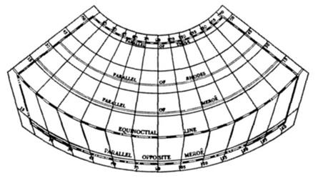 | Keywords: Layout of Ptolemys 1st Projection.png en A blank grid for construction of maps on Ptolemy's first modified conic projection Cropped from larger image Text removed <blockquote>Fig 6 13 a A reconstruction of Ptolemy's conic projection suggested for the construction of a map of the habitable world after a sixteenth-century copy courtesy Enoch Pratt Free Library </blockquote> 2014 Enoch Pratt Free Library via https //cnx org/contents/1Aah2uGj 1/Chapter-06-Cartography Ch 6 Cartography at OpenStax CNX Enoch Pratt; Christopher Houser other versions <gallery> File Ptolemaic projections png full image </gallery> cc-by-4 0 LlywelynII Map projections Ptolemy's first projection Christopher Houser OpenStax CNX Enoch Pratt |