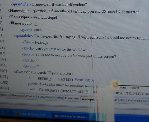 MAKE A MEME View Large Image LCD injury on IRC.PNG A picture of my monitor's odd defect caused by an AirSoft pistol Own 2008-01-03 Flameviper Public domain Bah I don't care Computer displays