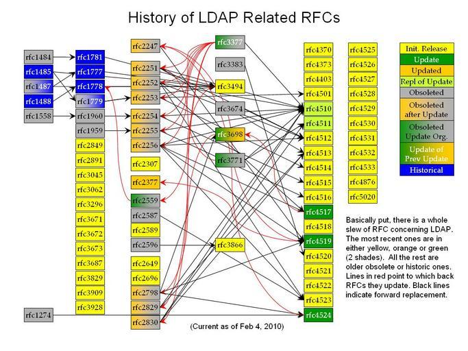 | Keywords: LDAP RFC Hist.jpg en I created this chart to visualize all of the related LDAP RFCs and their statuses own Wbenton 2010-02-04 Anybody who goes thorough all of the RFC's and documents which are obsoleted which obsolete which and which update which you could come up with your own but it's a daunting task to say the least Regardless it's now available for your viewing Check categories 2010 February 9 en wikipedia Lightweight_Directory_Access_Protocol 5 Abstraction Application layer protocols Computer security Internet protocols |