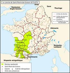 Keywords: Le concile de Saint-Pierre-de-Granon 673-675.svg fr Le concile de Saint-Pierre-de-Granon 673-675 Travail personnel sur un fond de carte hydrographique de historicair D'après Michel Rouche Des Wisigoths aux Arabes l'Aquitaine 418-781 naissance d'une région École des Hautes Études en Sciences Sociales Jean Touzot 1979 p 101 et Bruno Dumézil La reine Brunehaut éditions Fayard 2008 p 536 Romain0 2010-02-27 Maps of Gauls Maps of the Frankish territory SVG maps showing history in French |