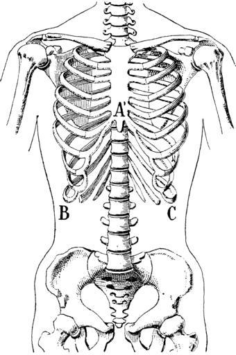 Keywords: Le Corset de Toilette - 38 Fig.png fr <div style text-align center >Squelette thoracique déformé d'après Chapotot </div> L'angle xiphoïdien A' B C s'est fermé le sillon central est visible au niveau des 8<sup>e</sup> 9<sup>e</sup> et 10<sup>e</sup> côtes Le Corset de toilette au point de vue esthétique et physiologique Paris Librairie Médicale et Scientifique M<sup>me</sup> M F Lacroix 1891-1908 PD PD-Art Le Corset de Toilette Language-neutral diagrams Images by Haabet |