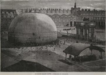 Keywords: Le grand ballon captif. Opération du gonflement.jpg Installation of the hot air balloon at the 1878 Paris World Fair Giffard who was at the origin of the project was a French engineer who created a few models of balloons and who also managed to create navigable ones The 1878 hot air balloon was located in the Tuileries For a fee visitors could enter its gondola and admire the view of the city The balloon could go up to about half a mile 1878 engraving 20 5 x 30 5 cm Institution Brown University Library object history exhibition history credit line Bitard Adolphe L' Exposition de Paris 1878 Rédigée par A Bitard avec la collaboration d'écrivains spéciaux Paris Librairie illustrée; Librairie M Dreyfous 1878 accession number 1254167453195254 PD-old Engravings of Paris Images of Paris from the Brown University Library Grand balloon ascents by Henri Giffard 1878 engravings Historical images of Arc de Triomphe du Carrousel Arc de Triomphe du Carrousel from the west Remote views of Arc de Triomphe du Carrousel |