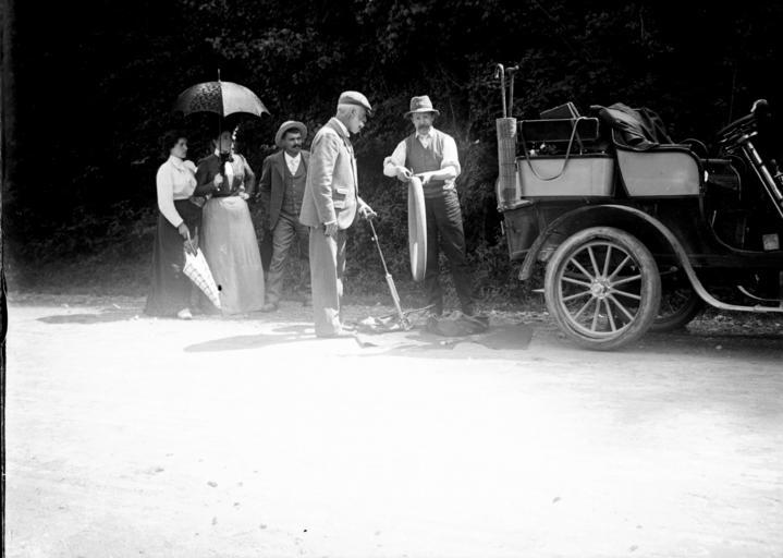 road men women automobile parasol breakdown flattire 1901 bibliothèquedetoulouse |