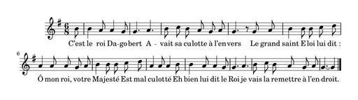 | Keywords: Le Roi Dagobert.svg Le Roi Dagobert fr LilyPond source <source lang text > \version 2 14 0 \header tagline f \score \relative c \key g \major \time 6/8 \partial 8 \autoBeamOff b8 b4 a8 a4 g8 g4 a b8 c b a g a g4 r8 g a b4 b8 b c d a4 a8 a g a b4 b8 b c d a4 a8 a4 b8 b4 a8 a4 g8 g4 a b8 c b a g a g4 ~ g4 \bar \addlyrics C ™est le roi Da -- go -- bert A -- vait sa cu -- lotte à l ™en -- vers Le grand saint E -- loi lui dit_ Ô mon roi vo -- tre Ma -- jes -- té Est mal cu -- lot -- té Eh bien lui dit le Roi je vais la re -- mettre à l ™en -- droit \midi \context \Score tempoWholesPerMinute ly make-moment 100 4 \layout </source> <score vorbis 1 > \relative c \key g \major \time 6/8 \partial 8 \autoBeamOff b8 b4 a8 a4 g8 g4 a b8 c b a g a g4 r8 g a b4 b8 b c d a4 a8 a g a b4 b8 b c d a4 a8 a4 b8 b4 a8 a4 g8 g4 a b8 c b a g a g4 ~ g4 \bar \addlyrics C ™est le roi Da -- go -- bert A -- vait sa cu -- lotte à l ™en -- vers Le grand saint E -- loi lui dit_ Ô mon roi vo -- tre Ma -- jes -- té Est mal cu -- lot -- té Eh bien lui dit le Roi je vais la re -- mettre à l ™en -- droit \midi \context \Score tempoWholesPerMinute ly make-moment 100 4 </score> valid SVG 2015-03-02 s fr Page Chansons populaires enfantines djvu/24 author other versions <gallery> File Le Roi Dagobert svg File Le Roi Dagobert mid File Le Roi Dagobert oga </gallery> Uploaded with UploadWizard Songs in French Sheet music of traditional origin |