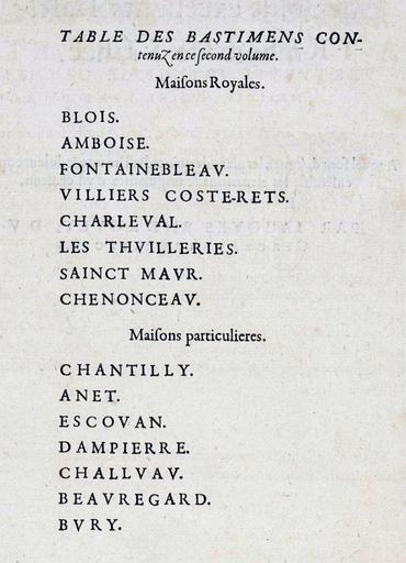 Keywords: Le second volume des plus excellents Bastiments de France - Table of Contents - INHA 2005.jpg Jacques I Androuet du Cerceau http //www purl org/yoolib/inha/363 INHA Creator Jacques I Androuet du Cerceau 1579 Le second volume des plus excellents Bastiments de France 2 Title pages from France Title pages in French PD-old-100 |