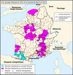 Keywords: Le synode d'Eauze en 551 et le concile de Paris en 552.svg fr Le synode d'Eauze en 551 et le concile de Paris en 552 Travail personnel sur un fond de carte hydrographique de historicair D'après Michel Rouche Des Wisigoths aux Arabes l'Aquitaine 418-781 naissance d'une région École des Hautes Études en Sciences Sociales Jean Touzot 1979 p 61 et Bruno Dumézil La reine Brunehaut éditions Fayard 2008 p 536 Romain0 2010-02-26 Maps of Gauls Maps of the Frankish territory SVG maps showing history in French |
