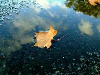 Keywords: leaf rain puddle autumn mirroring wet blue sky asphalt