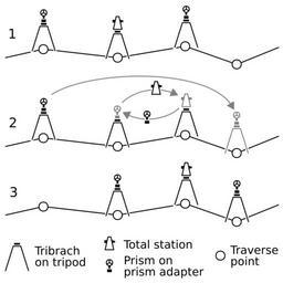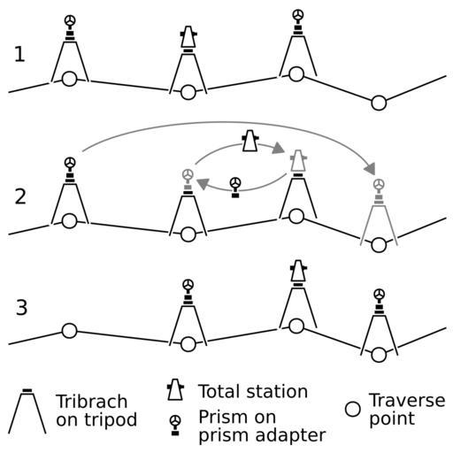 Keywords: Leapfrogging.svg traverses By only swapping the total station and the prisms and by having the tribrachs fixed to the tripods you will know that you have taken all the readings to and from the same points This will give a better result in the following calulations and if there is some flaved readings they will more easely be found Own Johan Gustafsson 2009-09-11 KJG2007 <gallery> File Tvångscentrering svg sv Tvångscentrering svg </gallery> Survey method diagrams |