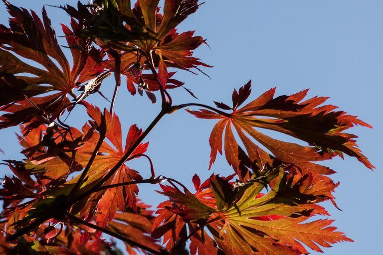 Keywords: leaves colorful color japanese maple yellow red brown recoloring the leaves yellowish red dye anthocyanin sun sky blue autumn