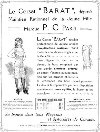 Keywords: LeCorsetBARATdeposeMaintienRationnol.png fr Le Corset «BARAT» déposé Maintien Rationnel de la Jeune Fille<br>Marque P C PARIS<br>Le Corset «BARAT» résultat perfectionné de quinze années <i><b>d'applications pratiques</b></i> réunit tu toutes les conditions exigées par la <i><b>Faculté </b></i><br>Très dégagé du haut sur le devant le busc remplacé par une bande <b><i>élastique ajourée</i></b> ce corset n'exerce aucune pression sur les organes et laisse à la croissance son libre développement Le dos et les épaulettes par leur disposition maintiennent <b><i>sans rigidité</i></b> le buste et les omoplates <br>CHOIX<br><I>Les différents numéros correspondent aux âges indiqués néanmoins il y a lieu de tenir compte du plus ou moins de longueur du buste c'est-à -dire que pour une taille longue on devra choisir un numéro au-dessus de l ™Ã¢ge et inversement pour une taille courte un numéro au-dessus <br>Pour le tour de taille indiquer la mesure prise sur la chemise sans aucun serrage </I><br>Corset BARAT en satin écru souple<br>qualité extra <br>N° 1 pour 7 à 9 ans 14 Fr<br>N° 2 pour 10 à 12 ” 15 »<br>N° 3 pour 13 à 14 ” 20 »<br>N° 4 pour 15 à 16 ” 22 »<br>N° 5 pour 17 à 18 ” 24 »<br>APPLICATION<br><b>Le Corset BARAT</b> <I>doit être porté avec un écart de laçage de 2 centimètres au maximum <br>Le corset convenablement choisi posé et boutonné sur la jeune fille sera d'abord très descendu devant puis maintenu fermement par les jarretelles <br>On procédera ensuite au laçage et enfin on ajustera les épaulettes à la demande </I><br>Se trouve dans tous Magasins et spécialités de Corsets <br>Vente en Gros J CLAPIN fabricant 7 rue du Coq-Héron PARIS en The Corset «BARAT» an effective support for a young girl <br>trademark P C PARIS<br>The corset Barat is the perfected result of fifteen years of practical experience and it meets all the conditions required by the faculty <br>BARAT corset satin off-white soft extra quality da Korsettet Barat en effektiv støtte for en ung pige <br>varemærke P C PARIS<br>Korsettet Barat er det perfektionerede resultatet af femten Ã¥rs praktiske erfaringer og det opfylder alle de betingelser der kræves af fakultetet <br> BARAT korset satin off-white blød ekstra kvalitet <br>Nr 1 for 7 til 9 Ã¥r 14 Fr <br>Nr 2 for 10 til 12 ” 15 » <br>Nr 3 for 13 til 14 ” 20 » <br>Nr 4 for 15 til 16 ” 22 » <br>Nr 5 for 17 til 18 ” 24 » a French journal Illustré anonymus 1911 PD File LeCorsetBARATdepose png PD-Art Corset advertisements Girls in corset 1911 advertisements Fashion in 1911 |
