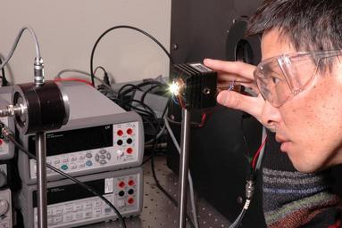| Keywords: LED Standands.jpg NIST scientists Yuqin Zong pictured and Yoshi Ohno have developed a new method for measuring the optical properties of high power LEDs that will allow manufacturers to accurately obtain and compare data By mounting the LED on a temperature controlled heat sink the researchers can test the LEDs at their normal operating temperature important to commercial manufacturers at high speed important to LED manufacturers 2008-11-20 19 49 11 https //www flickr com/photos/usnistgov/5941043182/ National Institute of Standards and Technology other versions PD-USGov National Institute of Standards and Technology |