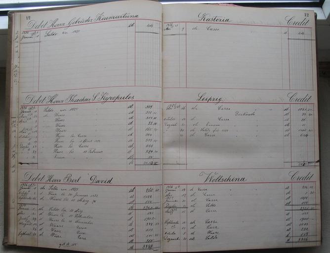 Keywords: Ledger of the fur trader Dedo from Leipzig, 1876-1885 012.jpg 011 013 Hauptbuch des Rauchwarenhändlers Dedo aus Leipzig Bismarcksstr o/P 78 No 11 Herren Gebrüder Kiumurtzina Kastoria Herrn Theodar S Kyropulos Leipzig Herrn Berl David Woltschina Woltschina probably the former name of a town in Russia Ledger of a wholesale fur dealer Germany Leipzig aus eigenem Besitz 1876 first entry Dedo PD-old Furriers and fur traders of Leipzig named in the accountancy of Naoum Dedo in Leipzig Kyropulos Th History of fur trade in Kastoria Kiumurtzina Furriers and fur traders of Kastoria named in the accountancy of Naoum Dedo in Leipzig Kiumurtzina Furriers in Russia David Berl Fur wholesale dealers in Russia David Berl Ledger of the fur trader Dedo in Leipzig 1876-1885 |