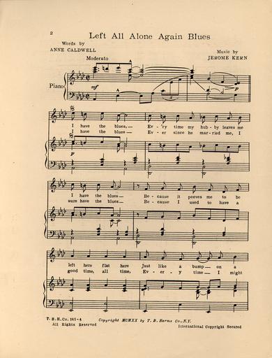 | Keywords: Left All Alone Again Blues 2.jpg Left All Alone Again Blues_ 2 jpg en Sheet music of Left All Alone Again Blues from the Broadway musical The Night Boat Page 2 of 5 Duke University Libraries Historic American Sheet Music collection http //library duke edu/digitalcollections/hasm b0820/ 1920 Music by Jerome Kern lyrics by Anne Caldwell Published by T B Harms Company New York 1945 Sheet music from The Night Boat | ||||